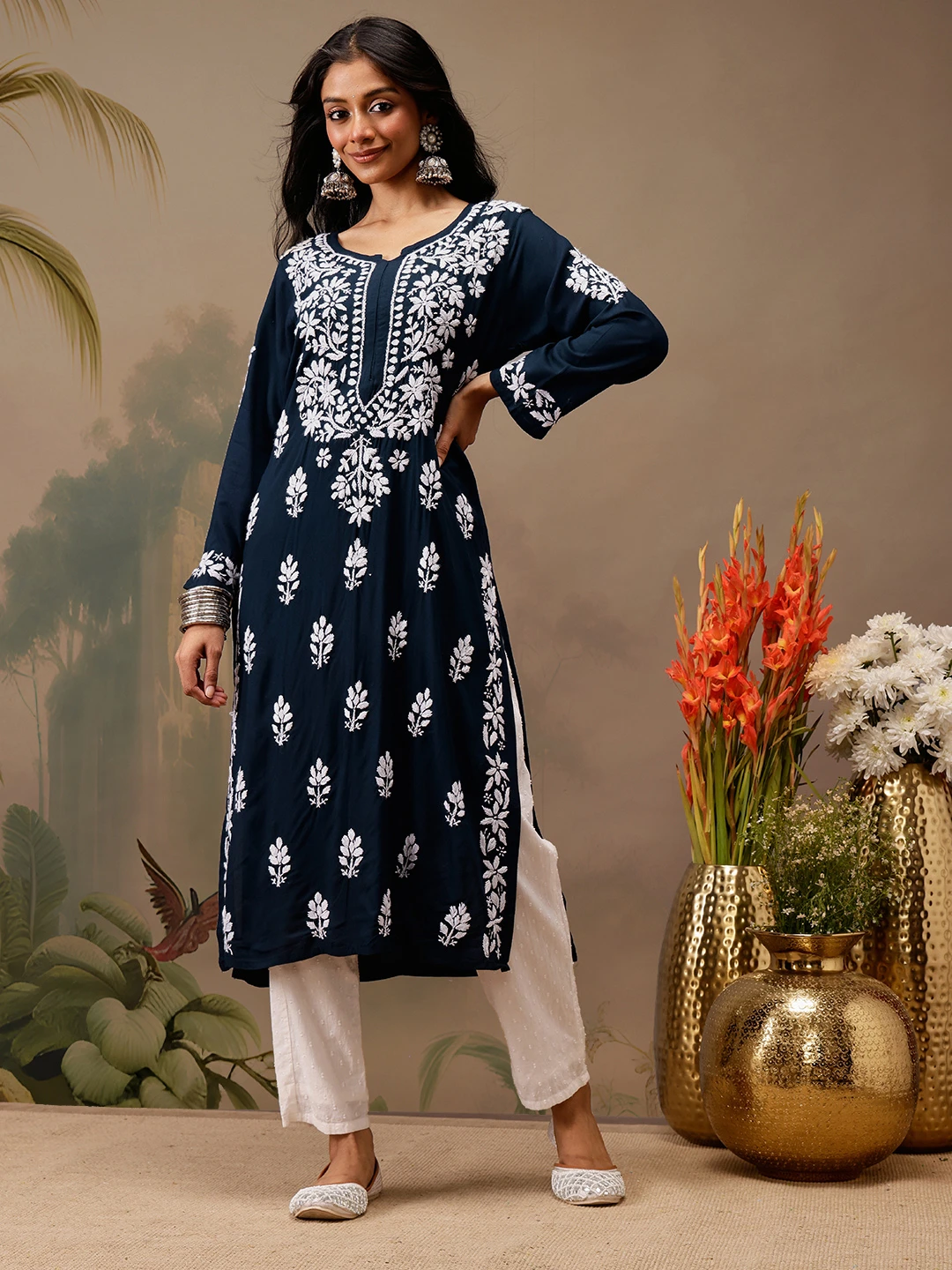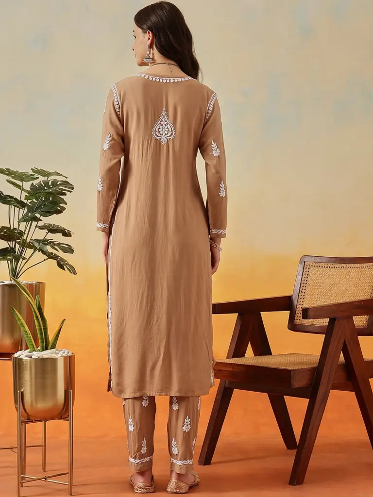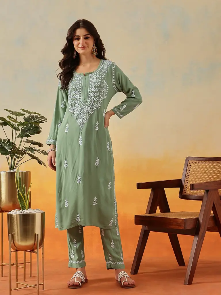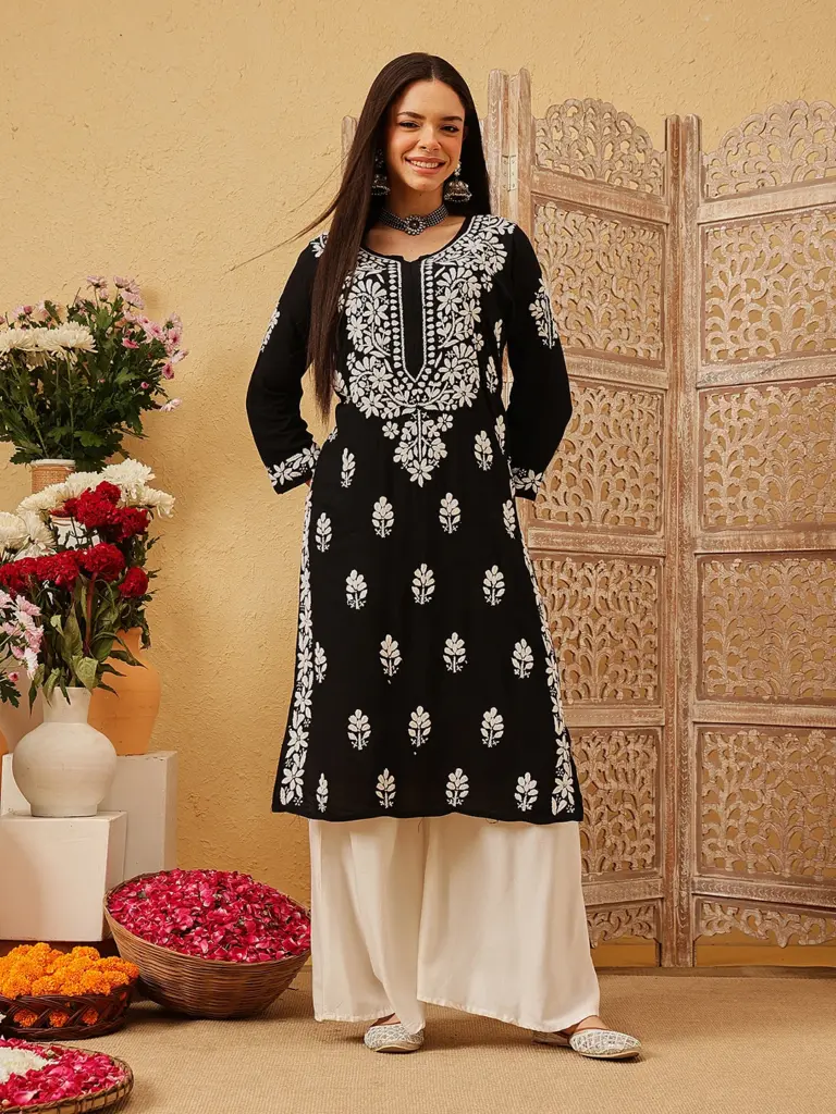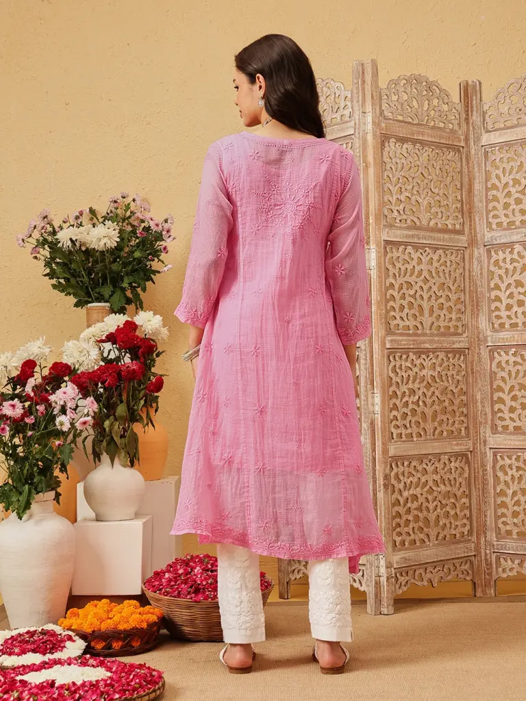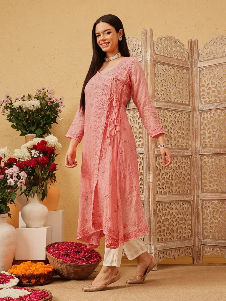 Hand Embroidered Grey Kota Lucknow Chikankari Angarkha Kurta with Slip