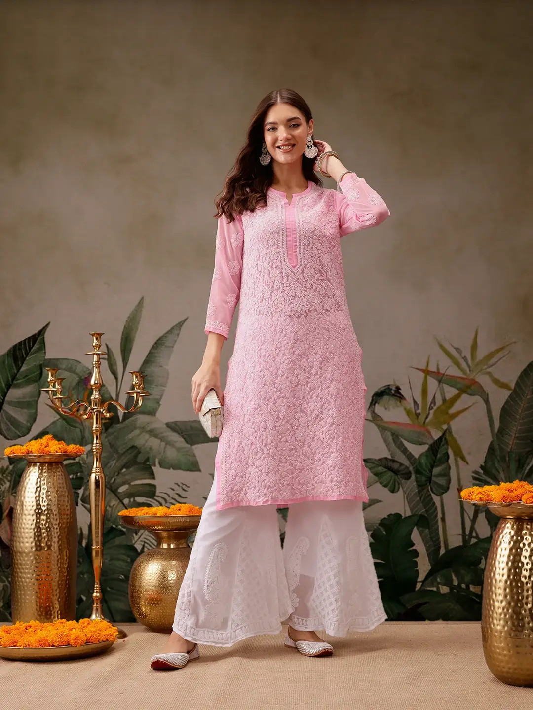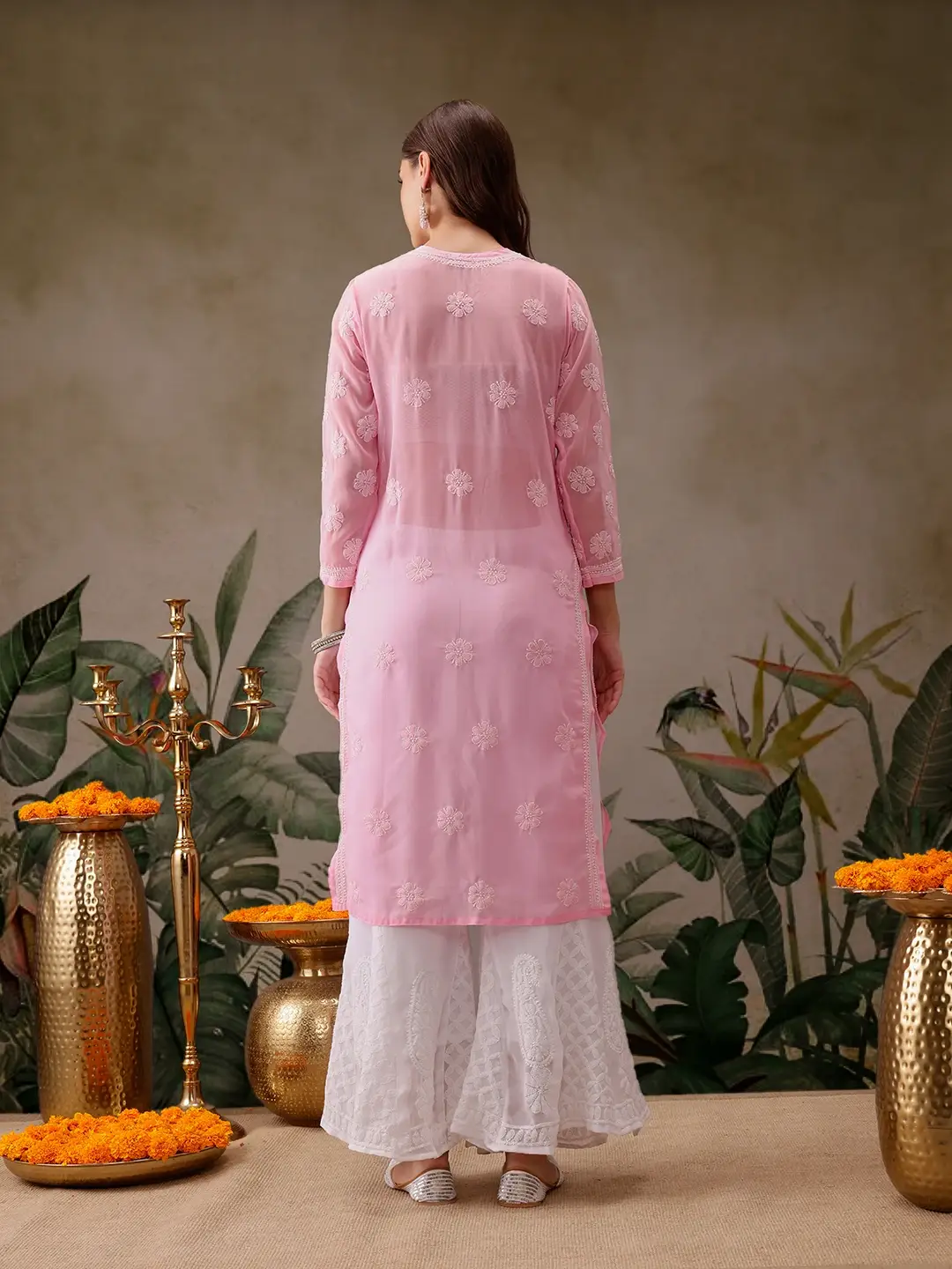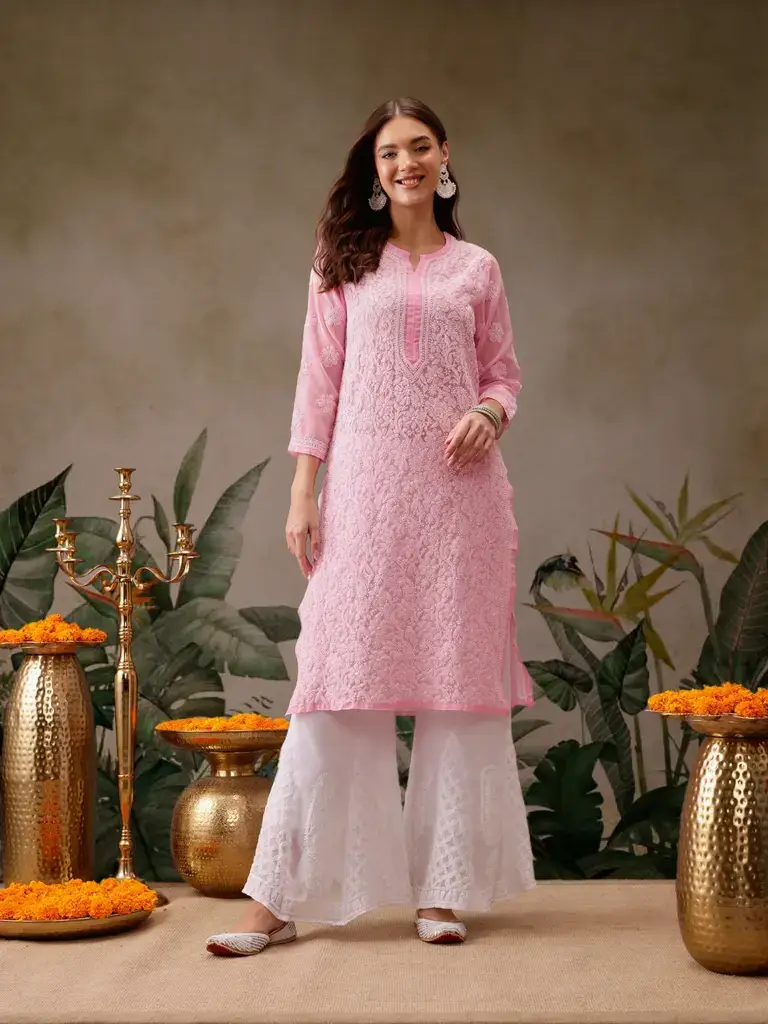 Kaashley Hand Embroidered Baby Pink Georgette Lucknowi Chikankari Straight Kurta With Palazzo