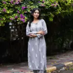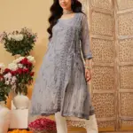 Hand Embroidered Grey Kota Lucknow Chikankari Angarkha Kurta with Slip