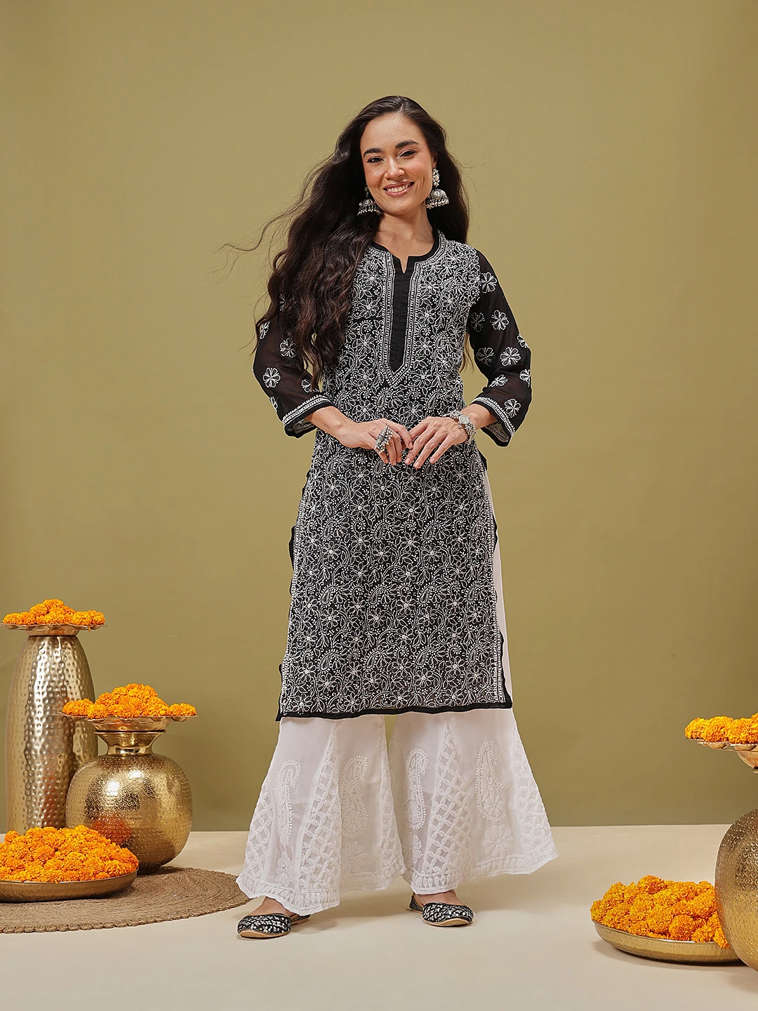 kaashley Hand Embroidered Black And White Georgette Lucknowi Chikankari Straight Kurta With Palazzo