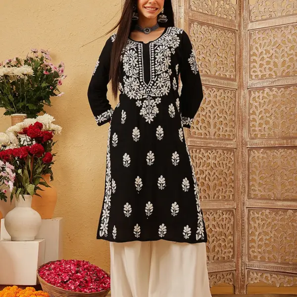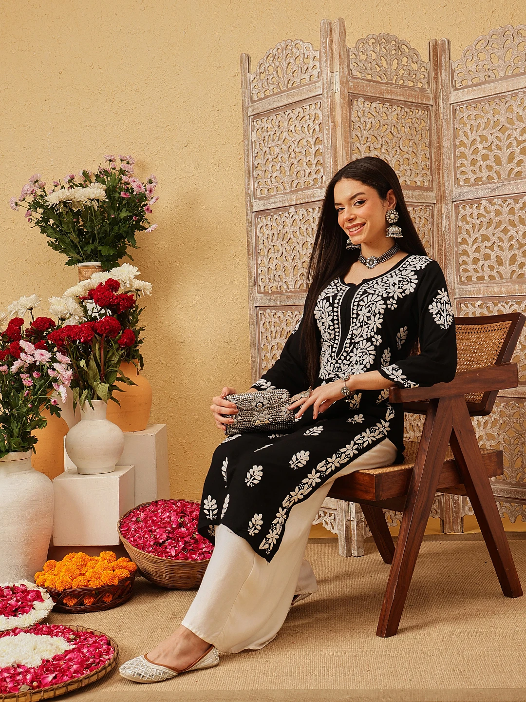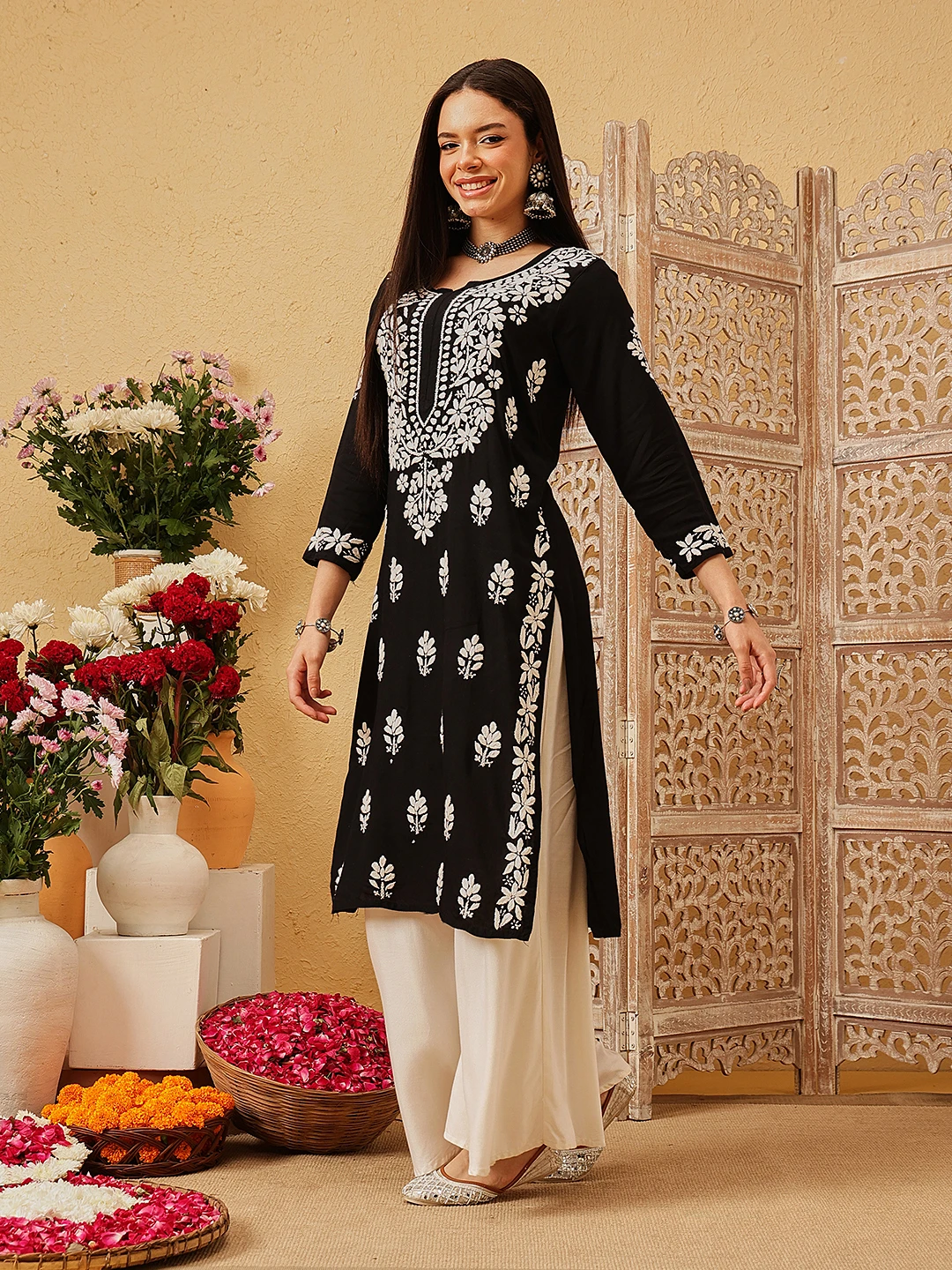 kaashley Hand Embroidered Black Rayon Lucknowi Chikankari Straight Kurta