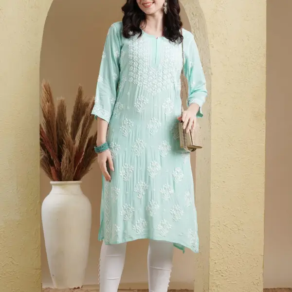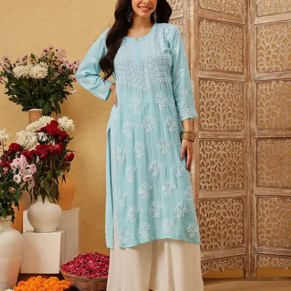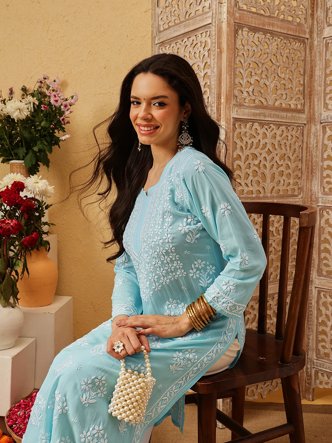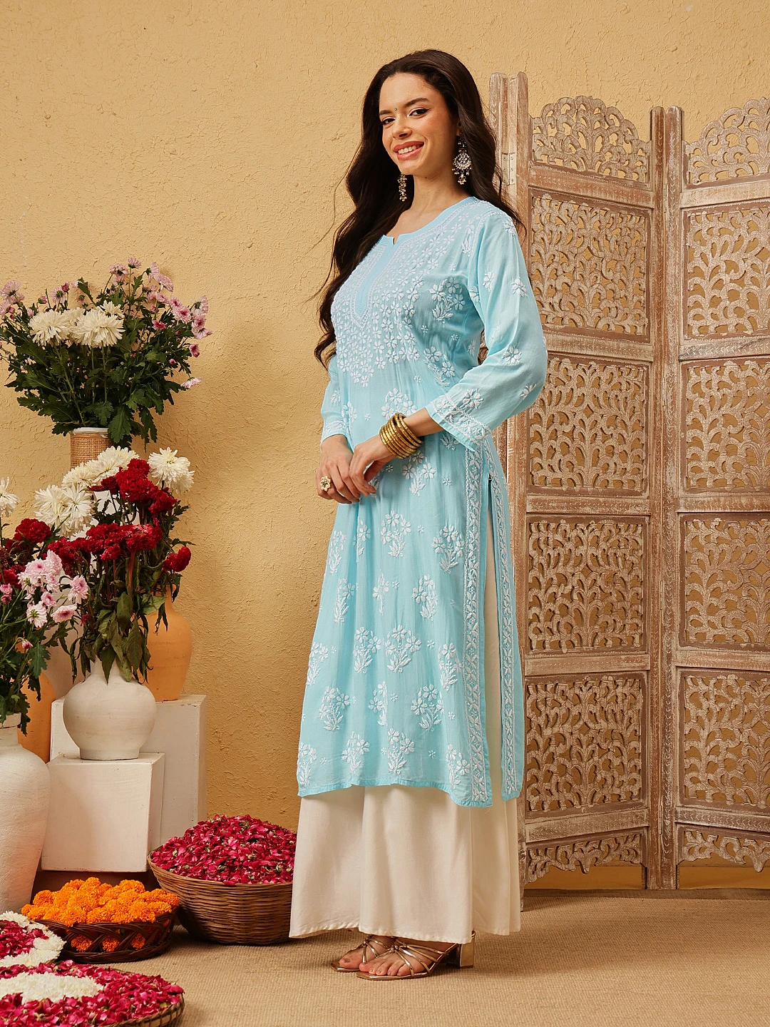 kaashley Hand Embroidered Blue Modal Lucknowi Chikankari Straight Kurta
