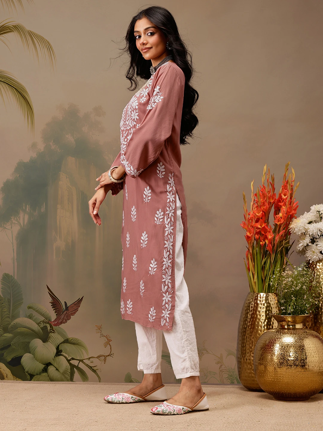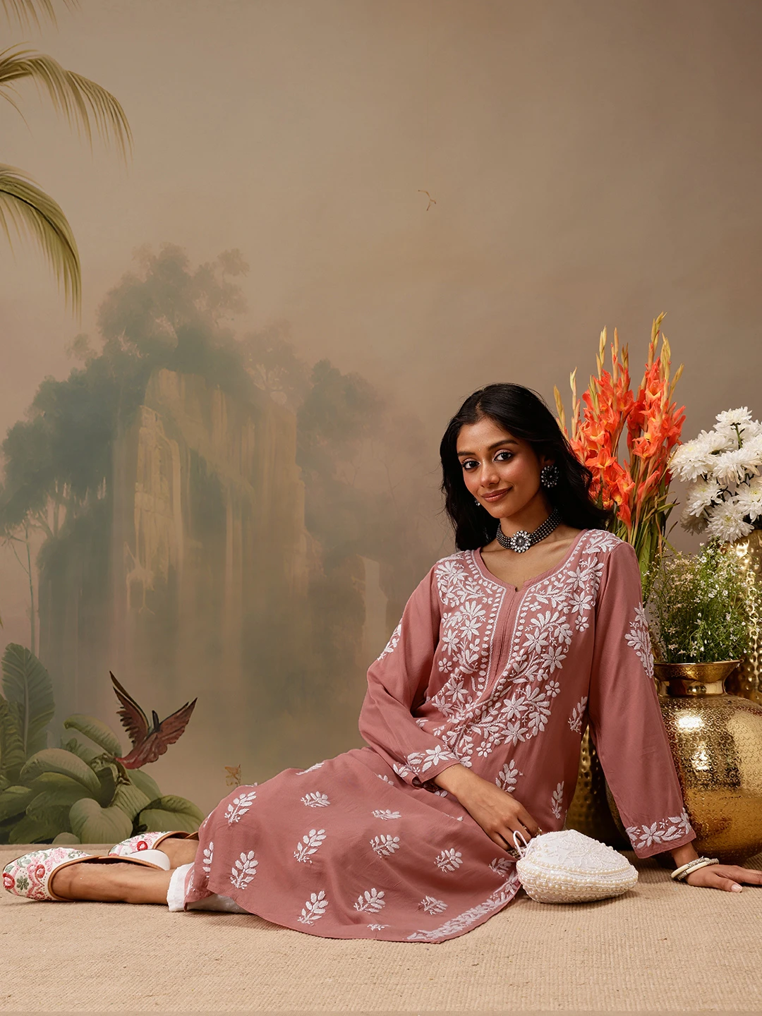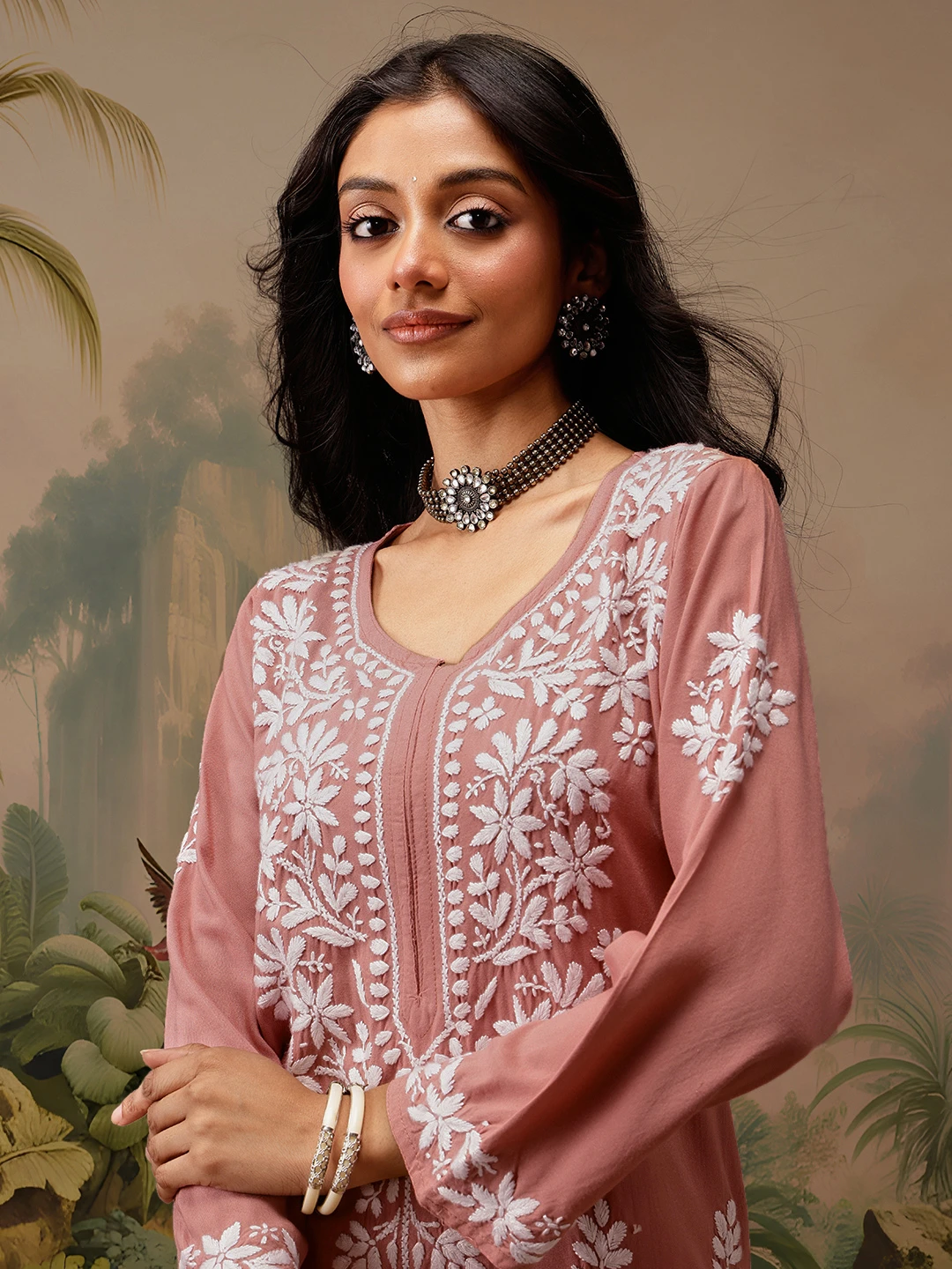 Hand Embroidered Grey Kota Lucknow Chikankari Angarkha Kurta with Slip