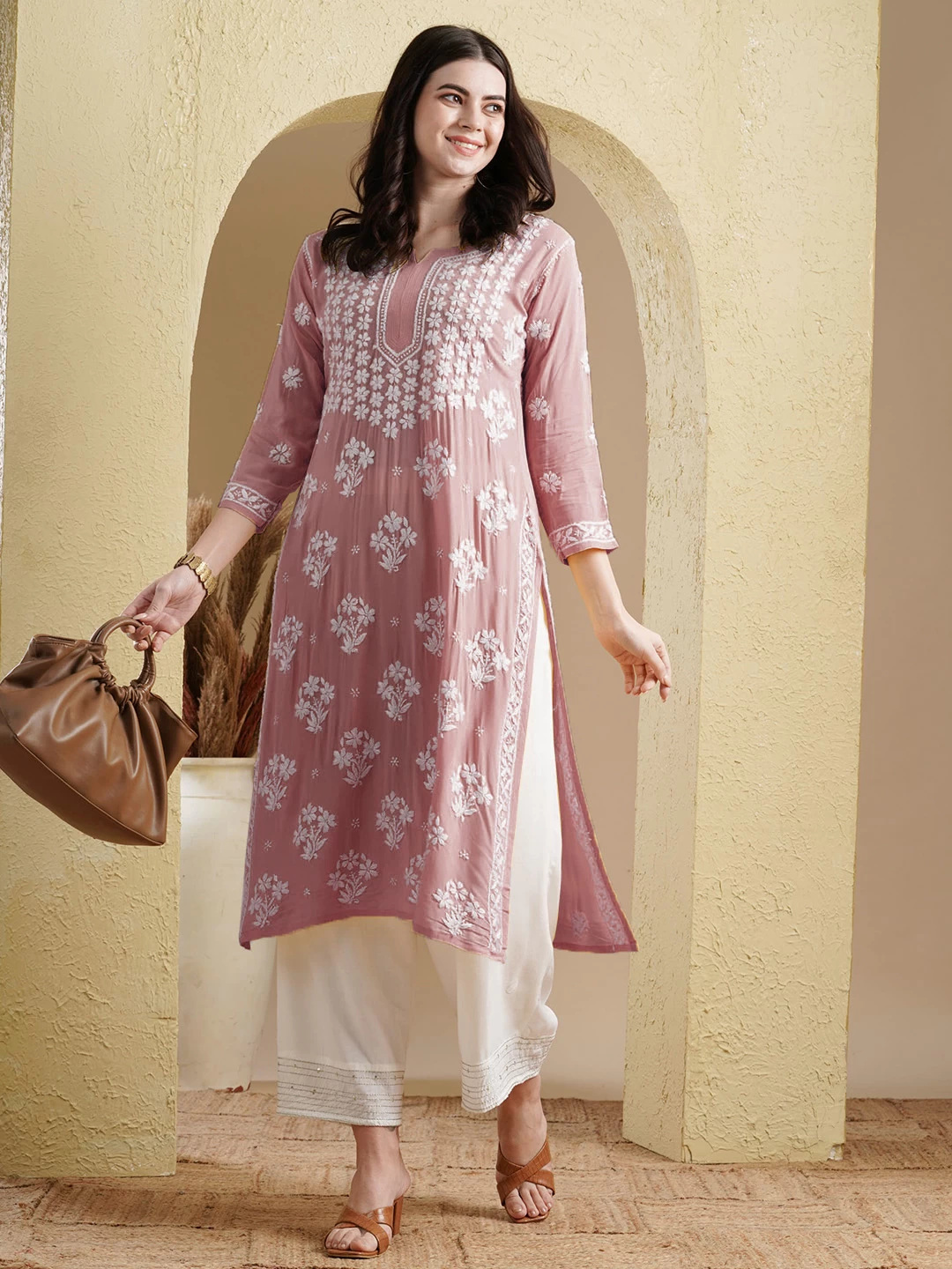 Kaashley Hand Embroidered Dusty Pink Modal Lucknowi Chikankari Straight Kurta