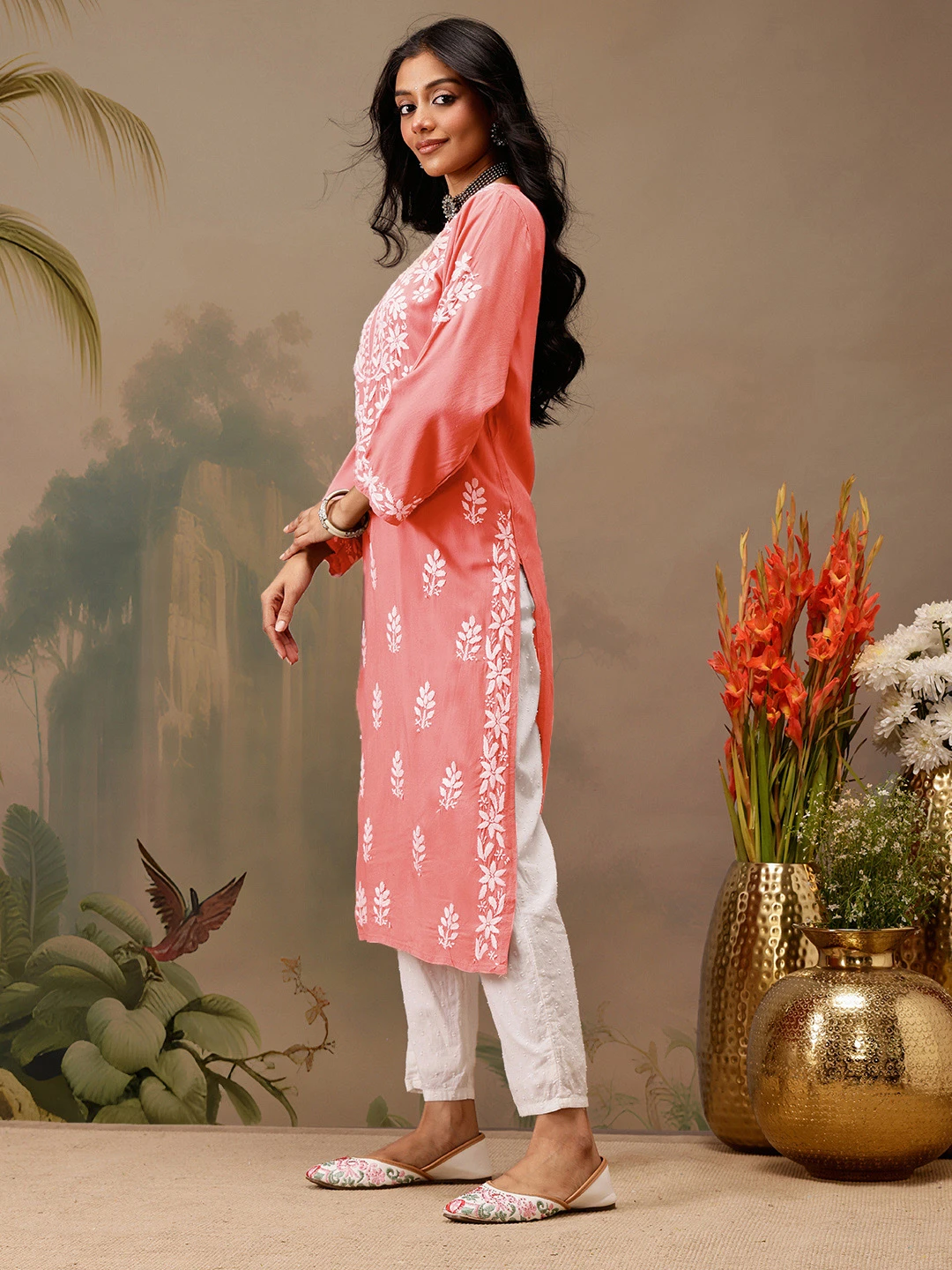 kaashley Hand Embroidered Peach Rayon Lucknowi Chikankari Straight Kurta