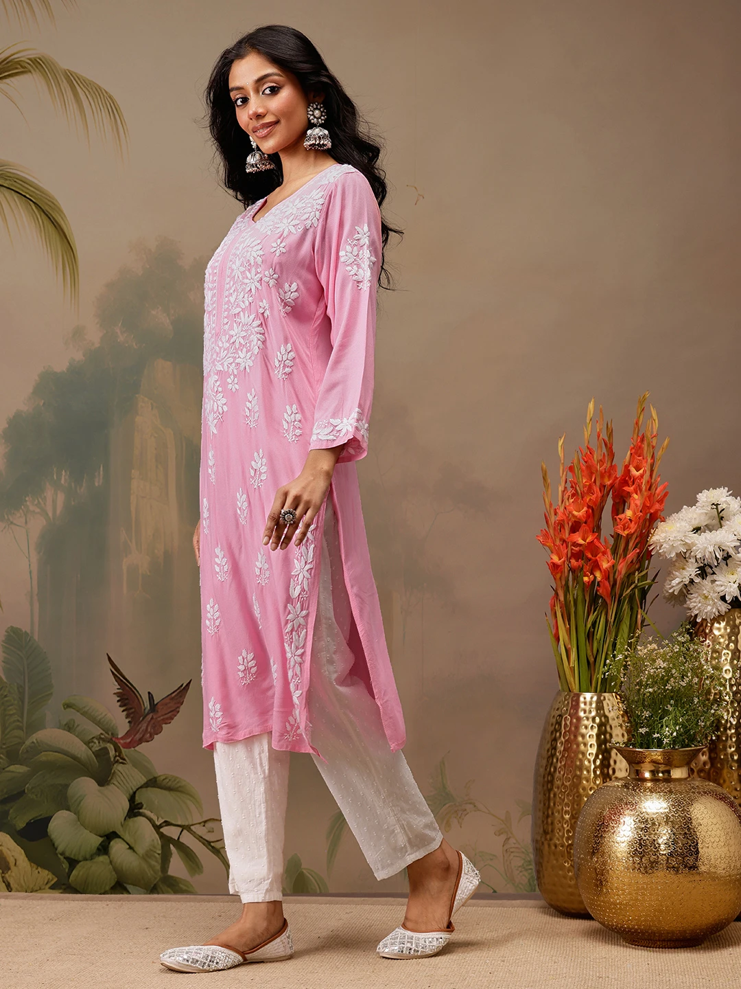 kaashley Hand Embroidered Pink Rayon Lucknowi Chikankari Straight Kurta