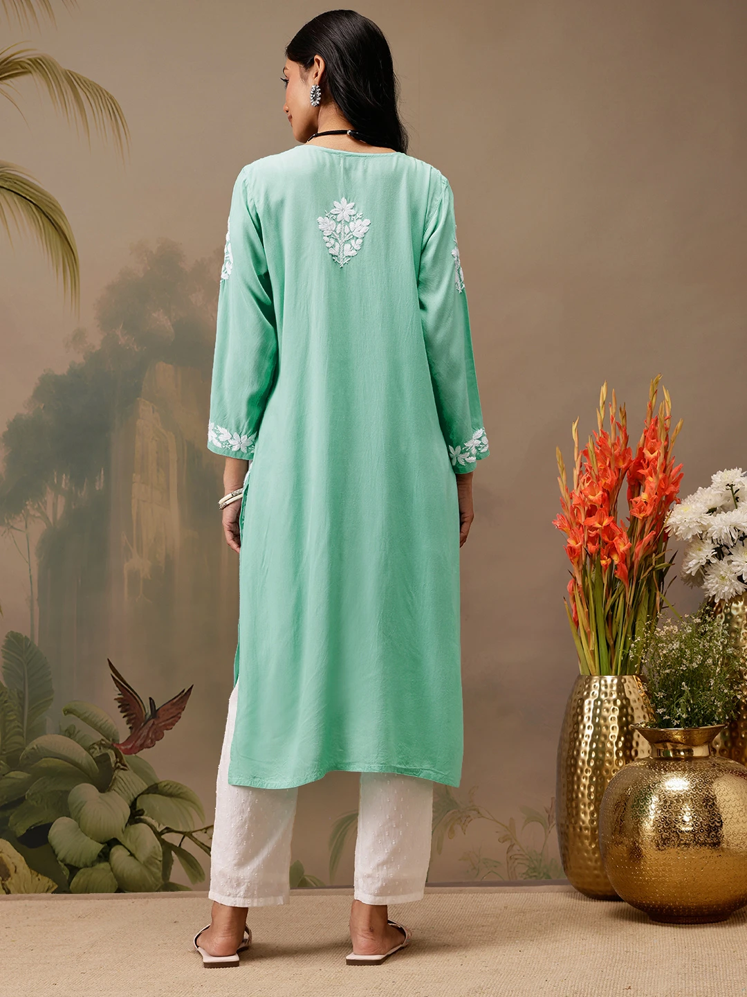 kaashley Hand Embroidered Sea Green Rayon Lucknowi Chikankari Straight Kurta