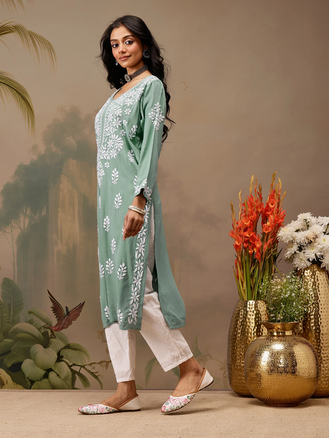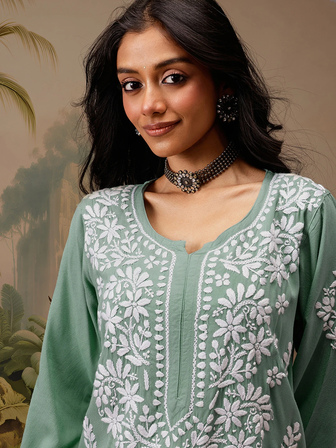kaashley Hand Embroidered Teal Green Rayon Lucknowi Chikankari Straight Kurta