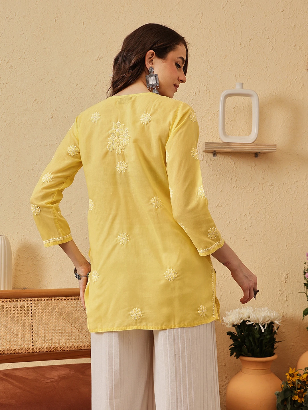 Kaashley Hand Embroidered Yellow Cotton Lucknowi Chikankari Short Kurti